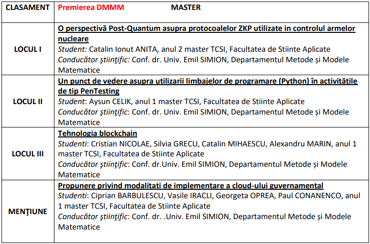 Conducător ştiinţific: Conf. dr. .Univ. Emil SIMION, Departamentul Metode și Modele Matematice
