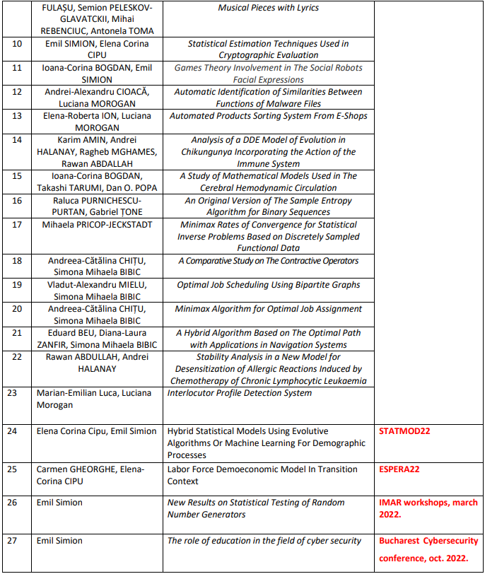 10. Statistical Modeling with Applications 2022, Bucharest, Romania, October 14-15, 2022 Elena Corina Cipu, Emil Simion [link: https://statmod2022.sciencesconf.org/]
